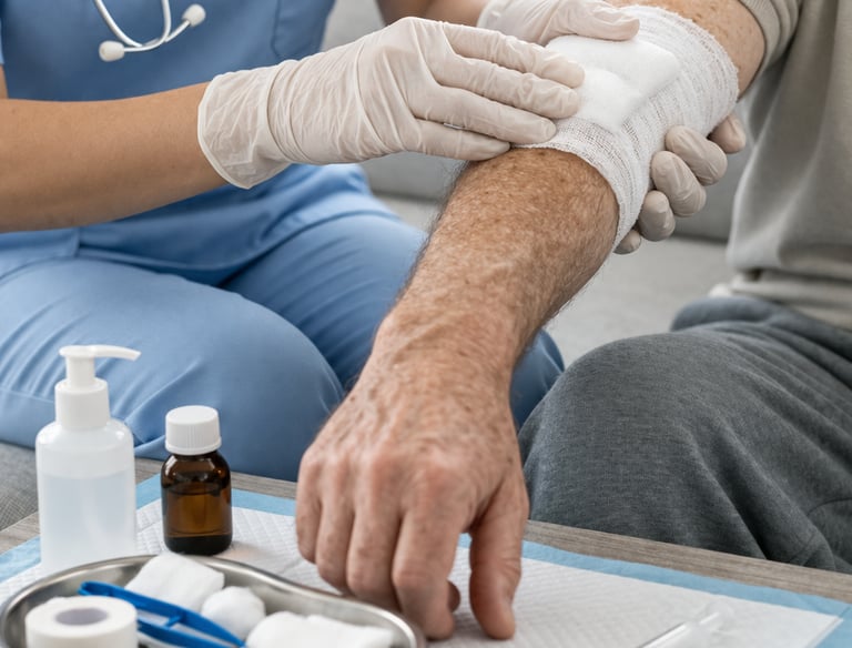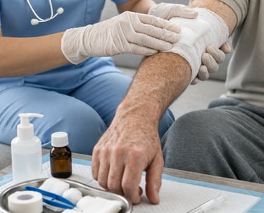 Curativos, medicações, acompanhamento de pacientes e cuidados contínuos realizados por equipe qualificada e supervisionada.
